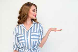 woman in blue and white striped top raising her left hand