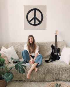 woman sitting in grey fur sofa